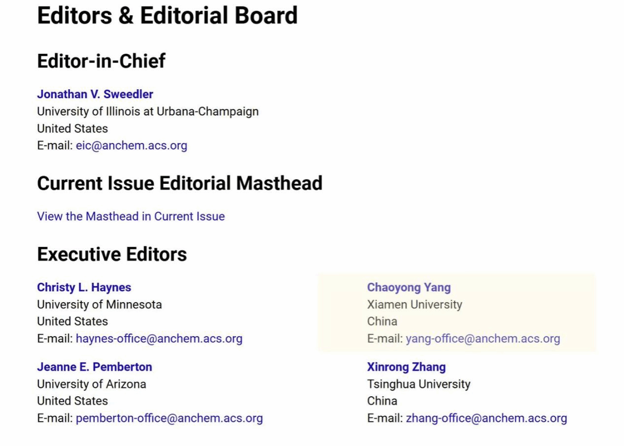 近日,杨朝勇教授正式履新,出任美国化学会旗舰刊《Analytical Chemistry》执行主编(Executive Editor)。《Analytical Chemistry》前身为1929年创刊的《Industrial & Engineering Chemistry, Analytical Editio...