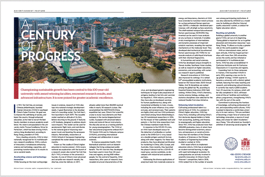 特刊以“Scaling New Heights(勇攀科研新高峰)”为主题,全面介绍了厦门大学百年办学征程中取得的重大科研进展和发展成就。主要内容包括校长访谈、校园简介及厦门大学自然科学和人文社会科学等一流学科和重点领域的特色发展及其重要创新成果。