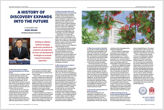 作为特刊的重要内容之一,厦门大学校长张荣的专题访谈以“A history of Discovery Expands Into The Future(承百年辉煌,迎创新未来)”为题,从“学校独特的文化特质、如何推动科技创新能力的提升、如何促进师资队伍的引进和培养、如何进行人才培养、如何加强国际交流与合作、厦门大学马来西亚分校的建设进展等六个方面,向Nature全球读者介绍了学校在百年办学历程中的治校理念、发展成就和前景蓝图。