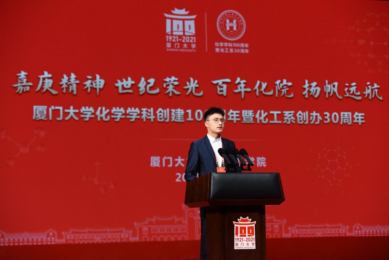 学生代表2018级博士生费家维在发言中分享了他人生中的三个选择。他表示,厦大化院勇攀科学高峰的精神给了他前行的力量,他由此坚定了走科研道路的信念。