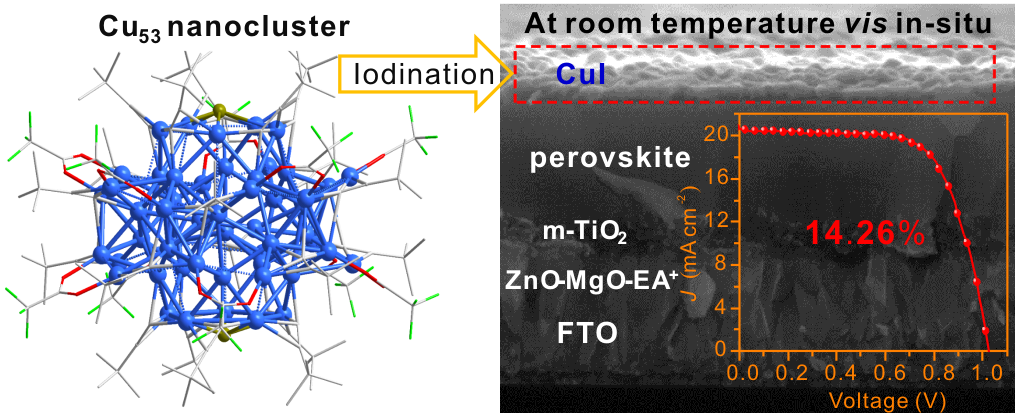 该纳米团簇的原子级精确结构由X射线单晶衍射仪和高分辨ESI-MS共同确定,具体结构式为[Cu53(RCOO)10(C≡CtBu)20Cl2H18]+ (Cu53)。Cu53为一个四套层结构(Cu3@Cu10Cl2@Cu20@Cu20),其中二十面体@十二面(Cu10Cl2@Cu20)结构也是首次在铜纳米团簇领域被报道。Cu53具有良好的稳定性,无论是固体状还是液态,均能在空气氛围中稳定10 天以上。更为新奇的是,Cu53拥有优良的醚溶性。研究者在洁净硅片上面旋涂Cu53乙醚溶液,经过SEM和AFM表征,团簇在硅片上形成了高质量的薄膜,厚度大约为10 nm。另外,Cu53可以在室温下快速与I3-发生碘化反应,生成高晶态的CuI。由于乙醚是钙钛矿太阳能电池的优良溶剂,研究者将Cu53前驱体旋涂在钙钛矿上形成纳米团簇薄膜,并将其转化为高质量的CuI薄膜。相较于商业CuI和其他Cu纳米材料而言,醚溶性Cu53作为前驱体制备的CuI膜更为均一致密。所制备的CuI薄膜是一种优良的空穴传输层,组装的电池效率可达14.3%,在高湿度条件下,电池100小时后仍保持92%的初始效率值,而空白组在20小时内迅速退化失活。相关研究展示,醚溶性Cu纳米团簇室温转化CuI薄膜作为优异的空穴传输材料,在光伏应用领域表现出巨大潜力。
