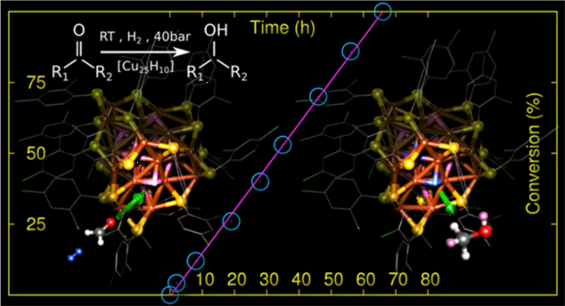 金属纳米团簇作为一种独特的纳米材料,因其独特的结构和性能而受到越来越多的关注,尤其是币金属纳米团簇,拥有新颖结构、性能的团簇不断的被报道,且相关应用也被不断地探索。相较于快速发展的Au和Ag纳米团簇,同样为币金属的Cu纳米团簇的研究较为滞后且方法局限。而在相似条件下合成并比较研究不同金属的相似物对纳米材料的设计、合成与应用都具有重要的指导意义,与此同时,金属纳米团簇作为结构精确的纳米颗粒,如何作为理想模型对纳米材料的催化等行为在分子尺度上进行理解还是该领域最具挑战性的课题之一。有鉴于此,厦门大学化学化工学院郑南峰教授课题组与于韦斯屈莱大学Hannu Häkkinen教授课题组合作,借鉴金银纳米团簇的合成,在温和条件下成功制备了“明星”团簇硫醇保护的“Au25/Ag25”的Cu类似物,Cu25。研究表明,Cu25具有不同于Au25/Ag25的结构,其中额外的氢负起到了至关重要的作用。而氢原子的确定往往只能利用中子衍射确定其位置,因此受到限制。本工作通过ESI-MS、低温单晶衍射、氢/氘核磁谱、键长分析结合理论计算,建立了一套简便通用的Cu-H纳米团簇的研究方法,摆脱中子衍射的条件限制。随后的应用研究显示,该团簇可在较为温和的条件下利用氢气催化酮加氢得到相应的醇。鉴于该团簇的精确结构,将理论计算和实验相结合,在分子尺度上揭示了铜-氢团簇催化酮选择性加氢的机制,明晰了活性位点及催化路径。