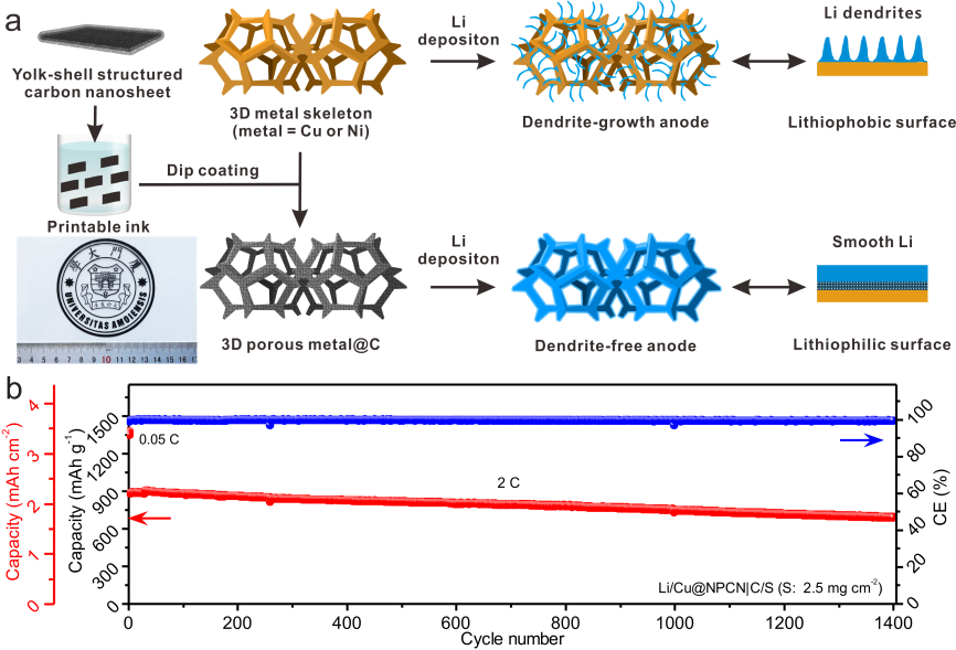 近日,厦门大学郑南峰教授和方晓亮博士课题组合作开发了一种亲锂三维多孔集流体用于构建高能量密度锂硫全电池。相关结果以“Robust Lithium Metal Anodes Realized by Lithiophilic 3D Porous Current Collectors for Constructing High-Energy Lithium-Sulfur Batteries”为题发表在国际期刊ACS Nano上(ACS Nano 2019, 13, 8337-8346)。