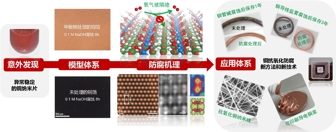 铜是一种具有优良的导热性、导电性和延展性的重要有色金属,已被广泛应用于日常生活和工业生产中。与铝和镍等金属不同,铜表面无法形成致密、稳定的钝化层,致使铜表面会被持续氧化腐蚀。历史上,铜的大规模使用得益于其抗氧化腐蚀技术(如黄铜、青铜等冶炼技术)的发展。虽然铜合金具有良好的减缓氧化能力,但其导热和导电性能往往被大打折扣。如何开发既有强抗氧化能力又能保持铜优越导电、导热性能的表面涂层技术,一直是铜抗氧化防腐领域备受关注和亟待解决的挑战性难题。该领域近年的一个重要进展是在铜表面修饰石墨烯或氮化硼,但这类方法往往涉及复杂的高温处理工艺,导致难以大规模应用。在前期意外发现以甲酸钠为还原剂所制备的铜超薄纳米片具有超强抗氧化能力的基础上,该研究团队发展了一种基于甲酸根表面配位保护的全新铜抗氧化防腐方法。该方法可应用于不同形态、不同尺度的铜材料防腐,具有普适性。