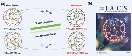 近日,我中心谢素原院士、谭元植教授、邓顺柳教授与西班牙加泰罗尼亚化学研究学院(ICIQ)的Luis Echegoyen教授合作,在内嵌金属富勒烯C2插入生长机理的研究取得重要进展,相关成果以“Two Metastable Endohedral Metallofullerenes Sc2C2@C1(39656)-C82 and Sc2C2@C1(51383)-C84: Direct-C2-Insertion Products from Their Most Stable Precursors”为题发表在《美国化学会志》(DOI:10.1021/jacs.3c04840),并且被选为当期内封面。
