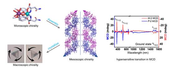 孔祥建教授团队近年来在稀土团簇的形成机理和模块组装方面开展了系统研究(J. Am. Chem. Soc. 2023, 145, 16983;J. Am. Chem. Soc. 2022, 144, 8837;J. Am. Chem. Soc. 2022, 144, 5653;Angew. Chem. Int. Ed. 2022, 61, e202200537;Angew. Chem. Int. Ed. 2022, 61, e202116296)。本工作基于前期研究基础,利用氨基酸衍生物构筑了手性分子模块基元[LnNiL2]+,该模块基元在配位键和氢键的驱动下组装成类似DNA的手性双螺旋结构。该组装体不仅有介观尺度的螺旋手性,其晶体也展现出手性几何形状,即宏观手性晶体。这表明手性在不同尺度上的连续传递,从微观手性碳原子、手性模块基元到介观螺旋二级结构,最终到宏观晶体的几何手性。X-射线单晶衍射分析和晶面关系研究揭示了手性晶体形成的两个关键因素:固有的晶面对称分布及其差异性的晶面生长速率。当手性分子中不同晶面族存在显著的生长差异时,就会导致结晶体的手性几何结构。此外,磁光响应研究表明,该双螺旋结构中稀土离子的超灵敏f-f跃迁显示出极强的磁光活性,以至于外加磁场可以翻转超灵敏跃迁处的CD信号方向。该研究不但揭示了超灵敏跃迁的强磁光活性,也为磁光材料的设计带提供了新思路。