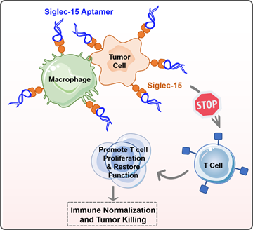 基于这一发现,我院宋彦龄研究团队提出了一种新型的核酸适体介导免疫检查点阻断(Ap-ICB)策略,旨在阻断免疫检查点Siglec-15与T细胞互作,从而激活T细胞。与传统抗体疗法相比,这种单链核酸适体由于分子量更小,具有更好的组织渗透性和较低的免疫原性。此外,适配体的小尺寸和缺乏Fc片段降低了它们引发免疫相关副作用的风险。通过从头定向进化,团队鉴定出一种高亲和力的单链DNA适体WXY3,它能特异性地结合Siglec-15,且平衡解离常数在纳摩尔级,为精准治疗提供了可能。体外实验表明,WXY3序列能够解除Siglec-15对T细胞的增值抑制作用,恢复T活性。在小鼠模型中,WXY3序列显著抑制了肿瘤生长和转移;此外,单细胞RNA测序技术揭示了WXY3治疗后肿瘤微环境中巨噬细胞和T细胞功能的增强。为了进一步提升抗肿瘤效果,还开发了基于WXY3的球形核酸(Ap-SNA),多价结合和空间匹配阻碍进一步增强了对Siglec-15介导免疫抑制的阻断效果,展现出更强的抗肿瘤活性。综上,针对免疫检查点Siglec-15的Ap-ICB策略,特别是WXY3适体及其衍生物Ap-SNA,为癌症免疫治疗提供了一种潜在的新途径,特别是对于那些对传统PD-1/PD-L1疗法有抵抗性的病例。
