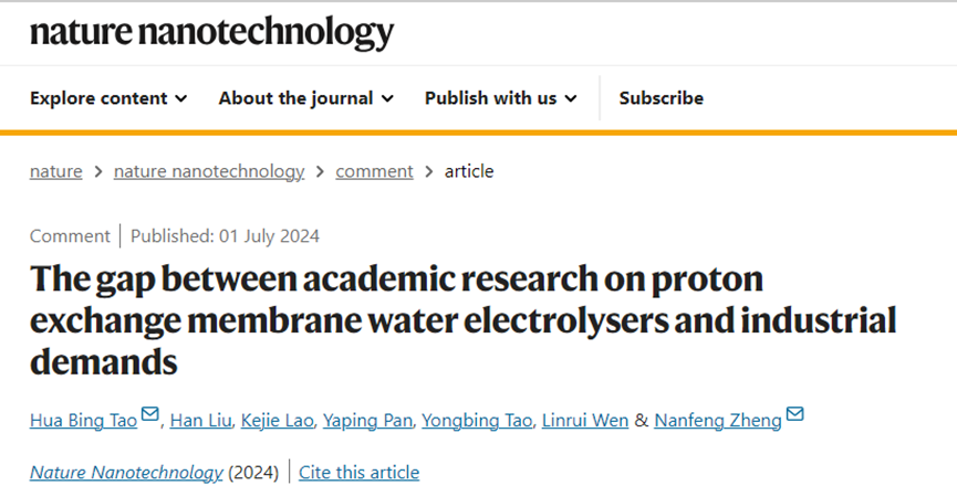 近日,郑南峰院士及陶华冰副教授研究团队应邀在Nature Nanotechnology期刊以“The gap between academic research on proton exchange membrane water electrolysers and industrial demands”为题发表评论文章(DOI: 10.1038/s41565-024-01699-x),深入探讨了质子交换膜电解水(PEMWE)技术在基础研究与工业应用之间存在的关键差距,并为未来研究方向提供一些思考。