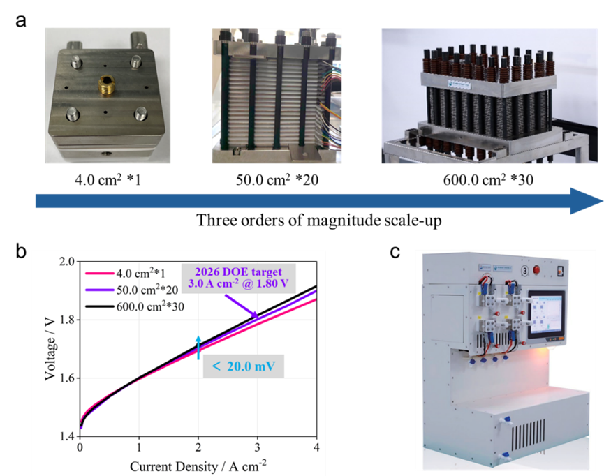 a. PEM电解槽从单个电池放大到100 kW的电堆。中国国家能源局认证的首台套先进设备“低铱载量高电流密度PEM电解槽”,