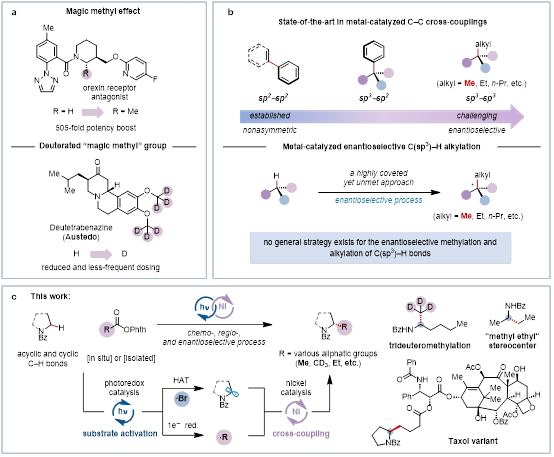 在药物开发中,脂肪族小烷基基团的战略性引入,特别是甲基,已被证实能够显著增强潜在药物分子的生物活性(图1a)。这种增强是通过优化分子的三维构型、脂溶性和代谢过程来实现的。这种现象通常被称为“魔法甲基效应”,其对于a-手性脂肪胺结构尤为显著。此外,选择性地引入“魔法氘代甲基”有望进一步改善药效,使其成为药物优化和开发的重要工具。然而,C(sp3)-C(sp3)键的催化不对称构建仍然是有机合成中的一个重大挑战(图1b)。碳氢键活化一直被视作“化学的圣杯”,sp3 C-H键官能团化则是圣杯中的明珠,是实现小烷基基团催化不对称引入的理想化方法。然而,sp3 C-H键的催化不对称烷基化是合成化学领域公认未解决的科学难题,因为相邻的sp3 C-H键通常具有非常相似的立体和化学性质,这个过程需要复杂的催化剂和精心设计的反应条件,才能实现化学选择性、区域选择性和对映选择性的同时控制。目前,针对非酸性C(sp3)-H键的不对称烷基化(例如甲基化、乙基化等)的通用策略尚未建立,这凸显了探索新的反应机制和催化策略的迫切需要。