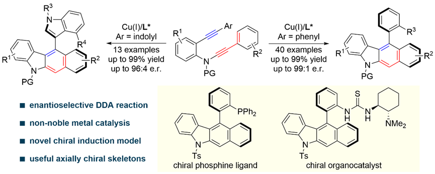 近日,课题组基于其先前有关铜催化二炔不对称环化反应(J. Am. Chem. Soc. 2019, 141, 16961; J. Am. Chem. Soc. 2020, 142, 7618; Chem. Sci. 2021, 12, 9466; Angew. Chem. Int. Ed. 2022, 61, e202210637; Angew. Chem. Int. Ed. 2022, 61, e202115554; Chem. Sci. 2023, 14, 3493; Angew. Chem. Int. Ed. 2023, 62, e202303670; Nat. Commun. 2023, 14, 7058; Nat. Commun. 2024, 15, 2232等)的研究基础,利用手性铜调控的新型远程手性诱导策略,从芳基取代的1,6-二炔底物出发,以廉价金属Cu(I)/SaBOX为催化剂,通过不对称DDA反应策略,以高产率和高对映选择性构建了一系列轴手性咔唑骨架。该反应具有以下特点:1)首次实现了非贵金属催化的对映选择性DDA反应;2)首次实现廉价金属催化的1,6-二炔环化;3)反应具有良好的底物普适性、高产率和高对映选择性;4)由该轴手性骨架衍生的手性膦配体和有机催化剂能够应用于不对称反应中,具有良好的应用前景。