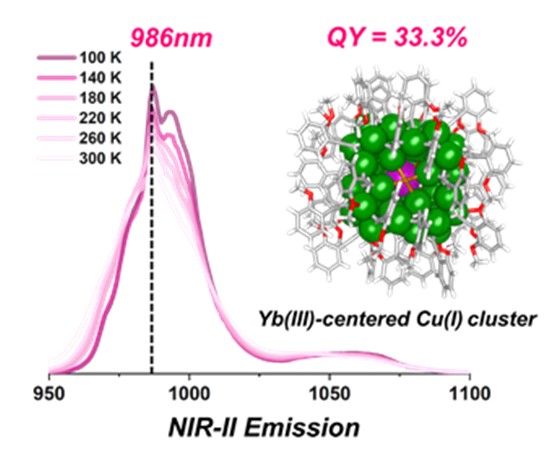 具有优异发光性能的币金属团簇由于其奇特的结构和潜在的应用而引起人们的广泛关注。然而,在币金属团簇中实现强近红外(NIR)发光极具挑战。孔祥建教授与龙腊生教授团队基于前期在稀土团簇的研究基础,通过引入具有优异发光性能的镧系离子,合成了第一例LnIII/CuI双金属团簇,LnCu54(Ln = Yb, Er, Gd)。结构分析表明,LnCu54团簇具有三层核壳结构,由36个配体保护的LnO6@Cu18Cl3@Cu36单元组成。研究显示,YbCu54团簇在986 nm处具有强NIR-II发光,固体量子效率为33.3%。本研究为合成具有优异发光性能的金属团簇提供了新思路。