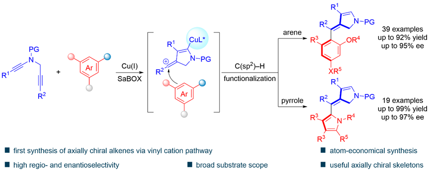 近日,课题组在本组有关炔烃转化的轴手性构建研究的基础上(Angew. Chem. Int. Ed. 2024, 63, e202411709; Nat. Commun. 2023, 14, 7058; Angew. Chem. Int. Ed. 2023, 62, e202303670; Chem. Sci. 2023, 14, 5918等),利用手性铜调控的新型远程手性诱导策略,从1,5-二炔底物出发,以廉价金属Cu(I)/SaBOX为催化剂,通过富电子苯环及芳杂环的分子间不对称C(sp2)–H官能团化反应策略,以高原子经济性和高对映选择性构建了一系列轴手性四取代烯烃骨架。该反应具有以下特点:1)首次通过烯基阳离子途径合成轴手性烯烃;2)首次实现廉价金属催化的二炔环化/分子间C(sp2)–H官能团化;3)反应具有良好的底物普适性和高对映选择性;4)该轴手性烯烃骨架在不对称催化领域具有一定的应用前景;5)通过理论计算解释了区域选择性、Z/E选择性及对映选择性的控制途径。