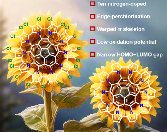 针对上述难题,该论文在以往合成弯曲纳米石墨烯(WNG)的研究基础上,通过十吡咯基碗烯的环融合反应,成功精准合成了以碗烯为核心的十氮杂负弯曲纳米石墨烯,命名为azaWNG。随后,研究团队通过氯化反应实现了azaWNG边缘的全氯化。由于精准掺杂了多达十个氮原子,并以缺电子的碗烯作为核心,azaWNG展现出极低的第一氧化电位,仅为–0.59 V,这使其成为迄今报道中最易被氧化的氮杂纳米石墨烯。因此,azaWNG能够高效地被单电子氧化剂AgPF6甚至大气中的氧气氧化,从而形成稳定的氧化态。此外,边缘全氯化不仅改善了azaWNG的溶解性,还提高了其化学稳定性,同时为精准表征其单晶结构提供了良好的条件。从结构上看,azaWNG的碗烯核心和外围十个聚合吡咯单元形似太阳花的花蕊和花瓣。