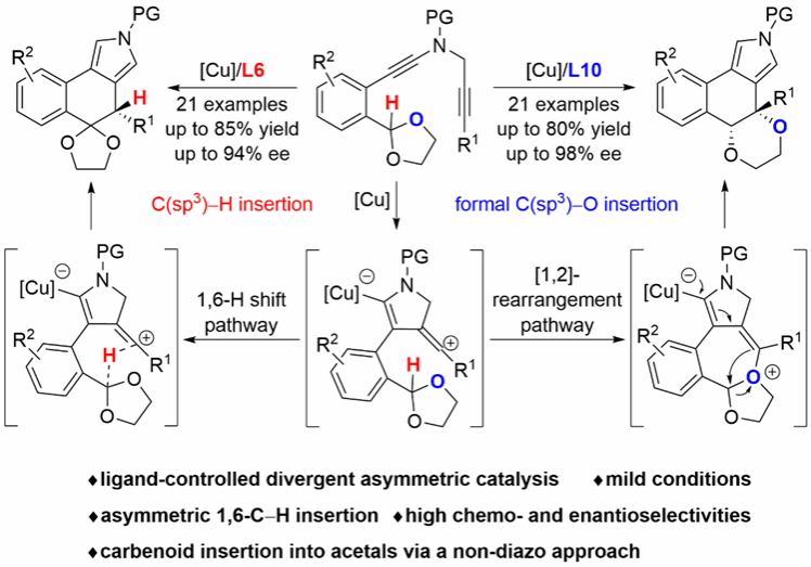 近日,叶龙武教授课题组基于其先前有关手性铜催化二炔环化反应的研究基础(J. Am. Chem. Soc. 2019, 141, 16961; J. Am. Chem. Soc. 2020, 142, 7618; Chem. Sci. 2021, 12, 9466; Angew. Chem. Int. Ed. 2022, 61, e202115554; Angew. Chem. Int. Ed. 2022, 61, e202210637; Nat. Commun. 2023, 14, 7058; Angew. Chem. Int. Ed. 2023, 62, e202303670; Chem. Sci. 2023, 14, 3493; Sci. Adv. 2024, 10, eadq7767; Nat. Commun. 2024, 15, 2232; Nat. Commun. 2024, 15, 9227; Angew. Chem. Int. Ed. 2024, 63, e202411709; Angew. Chem. Int. Ed. 2025, 64, e202418254),以缩醛取代的1,5-二炔为底物,廉价金属Cu(I)作为催化剂,通过不同手性SaBOX配体的调控,经二炔环化产生的烯基阳离子可被缩醛上不同亲核反应位点选择性捕获,从而可控地实现不对称C(sp3)-H键插入和形式C(sp3)-O键插入反应,以高区域选择性和高对映选择性构建系列手性螺环和稠环吡咯化合物。该反应具有以下特点:1)首例基于配体调控实现的不对称多样性插入反应;2)首例基于非重氮路径实现的不对称1,6-C(sp³)–H插入反应;3)首例基于非重氮路径实现的卡宾对缩醛的不对称插入反应;4)反应具有良好的底物普适性,高区域选择性和高对映选择性;5)理论计算进一步明析了该类可控不对称反应机理、化学选择性和对映选择性的控制模式。