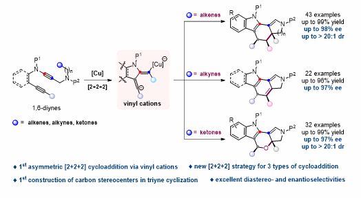 近日,叶龙武教授课题组在基于炔烃转化的杂环合成方法学研究方面取得重要进展,相关成果以“Copper-Catalyzed Asymmetric [2+2+2] Cycloaddition of Diynes via Vinyl Cations”为题在线发表于Angew. Chem. Int. Ed.