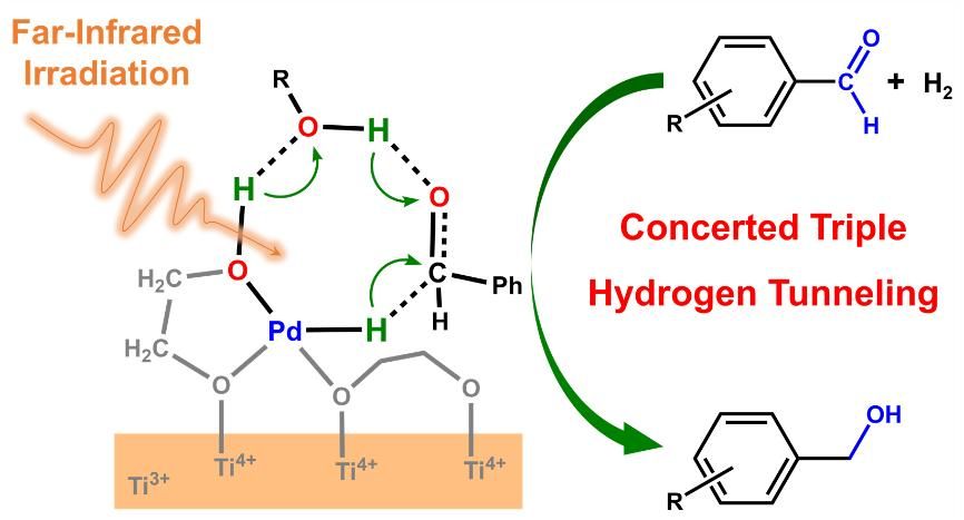 量子隧穿控制的化学反应被视为是继动力学控制和热力学控制之外的第三种反应范式。然而,在多相催化反应中关于隧穿效应的观测和机制研究十分有限。研究团队在前期工作(Science 2016, 352, 797-801; ACS Catal. 2024, 14, 11468-11476; Nano Res. 2024, 17, 228-234; Adv. Sci. 2025, e11391)基础上,以载体表面乙二醇配体配位原子级分散的钯基催化剂(Pd1/TiO2)作为结构明确的模型多相催化剂,揭示了氢的量子隧穿在室温下已可以主导催化加氢反应的进行。研究发现,在苯甲醛加氢反应中,质子型溶剂对于催化反应的进行至关重要。此外,当氢气(H2)和反应溶剂(CH3OH)同时进行同位素取代(D2, CD3OD)时,观测到超大的同位素效应(kH/kD≈2440)。系统研究表明,当质子型溶剂分子介于催化活性位点和反应底物醛之间时,形成的局域氢键网络有助于诱导发生氢的三重协同隧穿,即两个质子(H+)分别从催化活性位点的乙二醇配体转移到介导的溶剂分子和醛羰基的氧,另一个氢负离子(H-)从催化活性位点的单原子钯转移到醛羰基的碳。此外,由于质子型溶剂分子的参与可以改变隧穿势垒的宽度和高度,且远红外辐照可以激发氢键网络到更高的振动能级,因此本研究进一步通过溶剂效应和太赫兹光辐照实现了对氢隧穿概率的调控。本工作报道的弱相互作用及弱能量调控的量子隧穿过程在化学、物理和生命科学领域等具有重要意义。