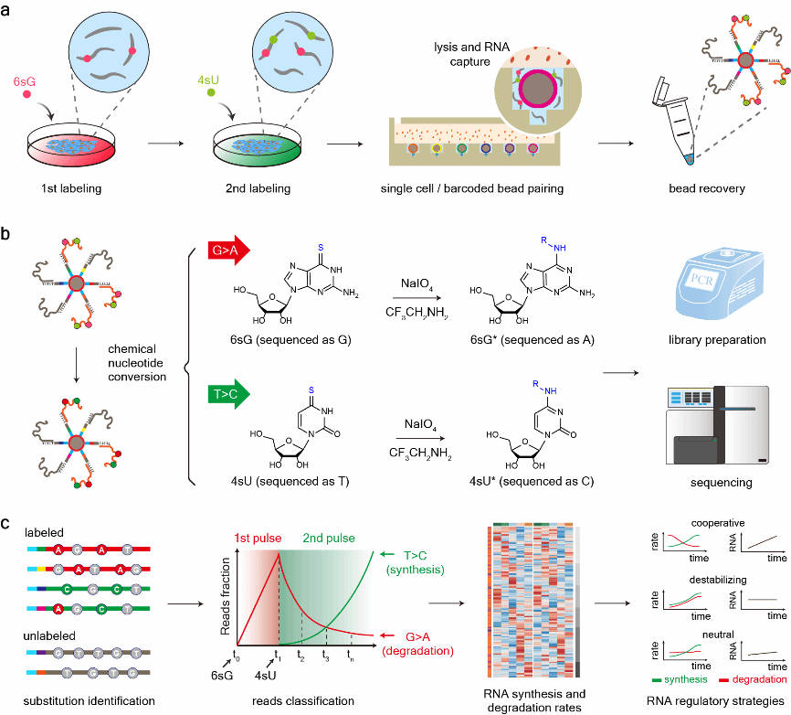 细胞基因表达是具有细胞异质性的动态过程,会随着细胞分化、胚胎发育以及外部环境刺激而不断变化。RNA作为基因表达的重要载体,是研究基因表达动态变化的关键分子,其水平由RNA的合成和降解过程共同调控。近年来,单细胞测序技术通过对单个细胞的分离与高通量测序,使研究者能够在单细胞水平解析基因表达模式,揭示细胞间的异质性。然而,目前大多数单细胞测序方法仍只能捕捉某一时间点RNA的静态丰度,难以同时测量RNA合成与降解速率,从而限制了对RNA动态调控机制的深入理解。