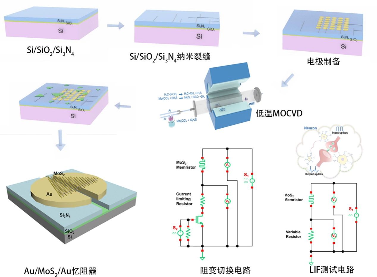 随着人工智能及其应用的快速兴起,神经形态计算因其低功耗、类脑计算属性成为了当前电子信息领域的研究重点,而具有存算一体功能的MoS2器件,因最有希望与现有芯片工艺兼容,实现大规模阵列制备,2022年正式被IEEE列入了芯片的发展路线图。将MoS₂忆阻器集成到先进工艺节点中,需要制订随特征尺寸变化的设计规则,其中一项核心挑战在于深入理解与精准把握MoS₂忆阻器的纳米尺度效应,即MoS₂忆阻器的操作电压、开关时间、突触可塑性等关键参数随着沟道长度的变化规律。目前已报道的MoS₂忆阻器纳米尺度效应研究多聚焦于100 nm以上沟道,其结论不可避免地被MoS₂薄膜中的晶界散射、缺陷分布等宏观统计效应所掩盖。在当前5 nm、3 nm乃至2 nm CMOS工艺已快速商用的背景下,系统研究纳米尺度MoS₂忆阻器的尺度效应,不仅是开发兼容CMOS先进工艺节点的MoS₂忆阻器设计规则的前提,也是实现高密度神经形态电路的基础。