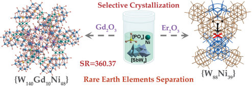 高核团簇具有漂亮的分子结构和有趣的物理化学性质,一直是团簇化学的前沿热点,但巨型团簇的可控构筑仍面临巨大挑战。本研究利用缺位多酸为无机配体,通过稀土离子的调控构筑了系列高核多酸异金属氧簇。研究发现,稀土离子通过不同的作用模式调控了簇合物的生长路径。稀土Er3+可作为诱导剂促进关键中间体[W33Ni21]的生成,从而组装出具有“泰迪熊”构型的巨型多酸-过渡金属氧团簇{W88Ni39};更大半径的 Gd3+则被稳定捕获并生成巨型多酸稀土-过渡金属氧团簇{W140Gd10Ni48}。基于此,本研究实现了无需有机溶剂的一步高效稀土分离,为绿色稀土分离提供了新思路。