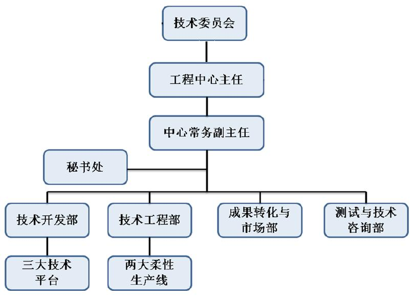 技术委员会指导下的主任负责制对福建省纳米制备技术工程研究中心的高效运行起着举足轻重的作用,因此,纳米制备技术国家地方联合工程研究中心继续沿用了主任负责制的组织机构(如图1),由主任、常务副主任和各部门负责人构成核心管理层,指导团队的分工协作,高效完成技术与产品的开发与评价、工程化、市场化的整个产业化过程,下设秘书处以及技术开发部、技术工程部、成果转化与市场部、测试与技术咨询部四个部门。
